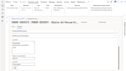 If user clicks ok, the updated address in purchaseorder header should be populated to current newly created line.If user clicks cancel the purcline vendor tax information should be empty.